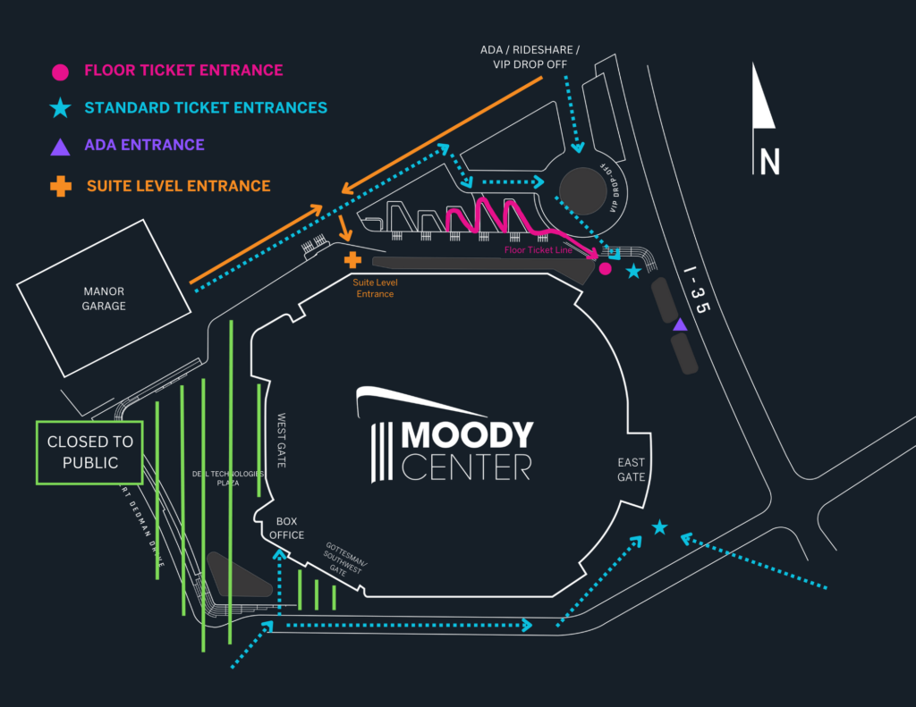– Guests with floor tickets can arrive and begin lining up at 4:00PM at the northeast corner of Moody Center near the VIP/ADA drop-off circle, closest to I-35.